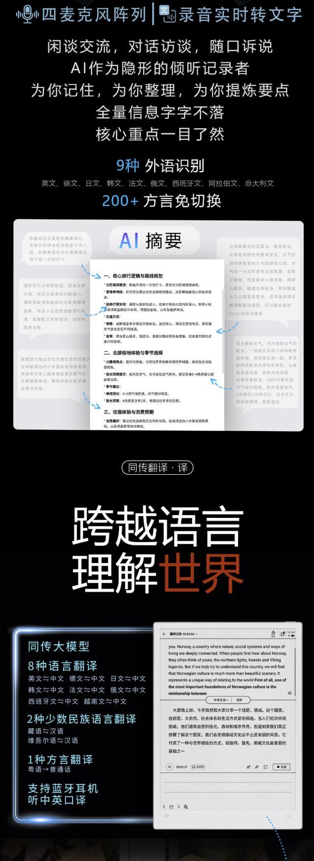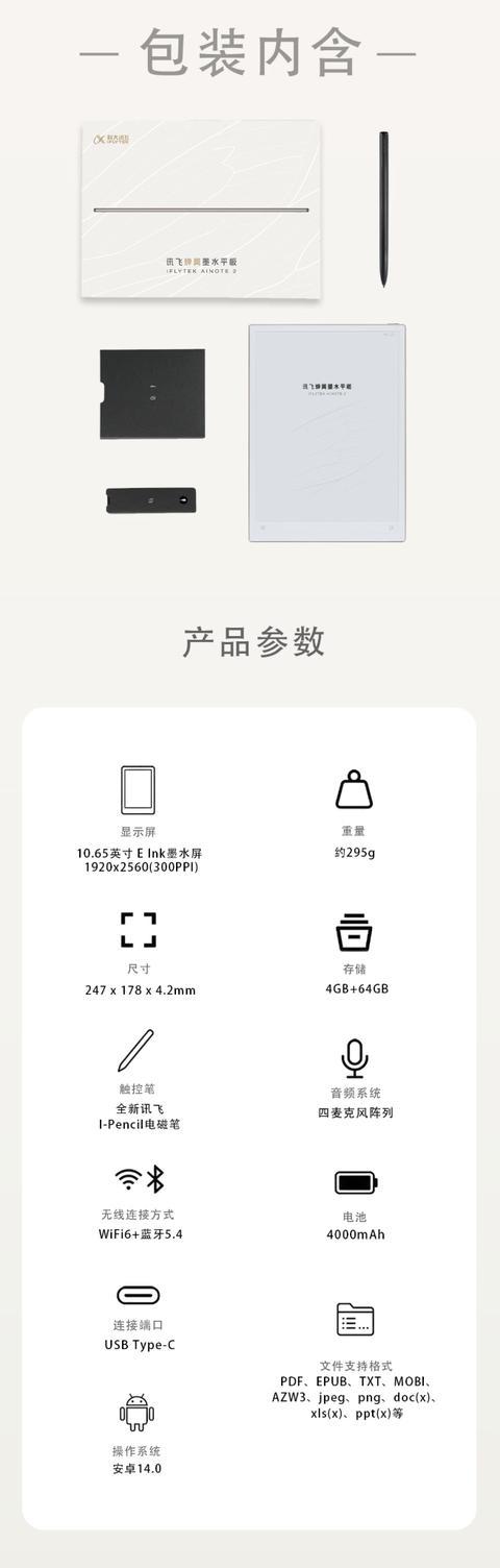 该机搭载 4GB RAM 和 64GB 存储空间,内置 4000 mAh 电池。软件方面该机搭载安卓 14 系统,提供了科大讯飞定制的多种 AI 功能,包括摘要、录音转文字、融合笔记等。