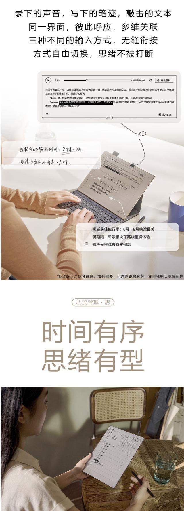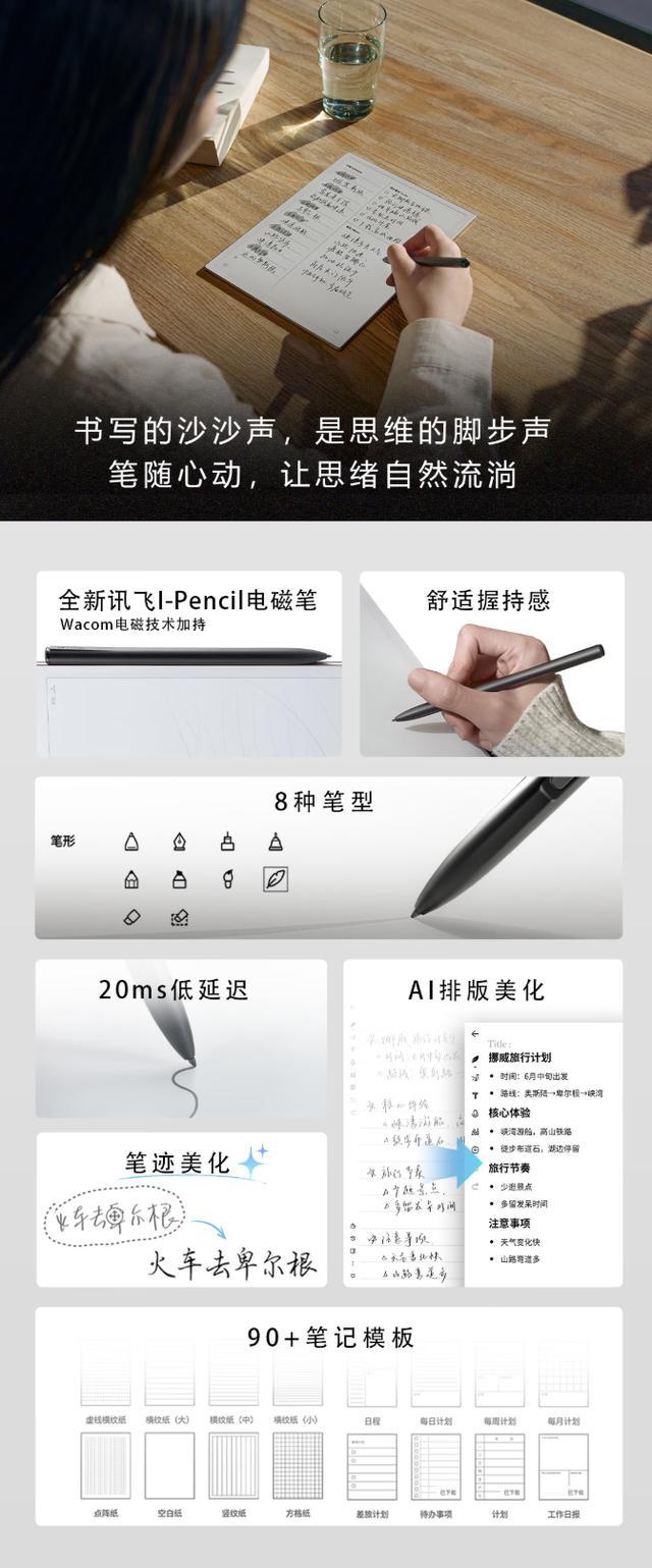 该机采用镁铝合金机身,厚 4.2mm、重 295g,正面配备一块 10.65 英寸 1920x2560 分辨率 300PPI 黑白墨水平面板(支持讯飞 I-Pencil 电磁笔手写)。