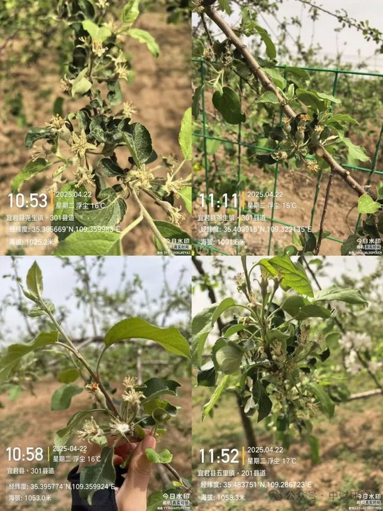 据中国天气网数据显示,4 月陕西主产区气温波动剧烈,陕西北部、甘肃东部 4 月 20-22 日出现 6-7 级大风,导致刚进入盛花期的果园花粉流失,坐果率下降;且4 月中旬又遭遇- 5℃至-7℃低温天气,导致洛川旧县镇、富县茶坊镇等地有幼花花心冻黑情况,宜川等地区花心遭受冻害。叠加持续扬尘天气,缺乏降雨土壤干旱,导致墒情不佳,影响坐果。随着产区苹果陆续进入坐果期,中财苹果调查研究人员前往西部部分产区进行调研。